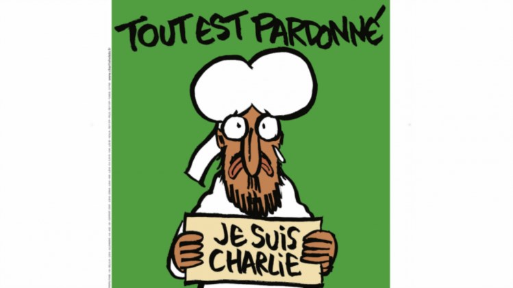 Acima lê-se: Tudo está perdoado. Abaixo: uma caricatura de Maomé com um cartaz "Je Suis Charlie".